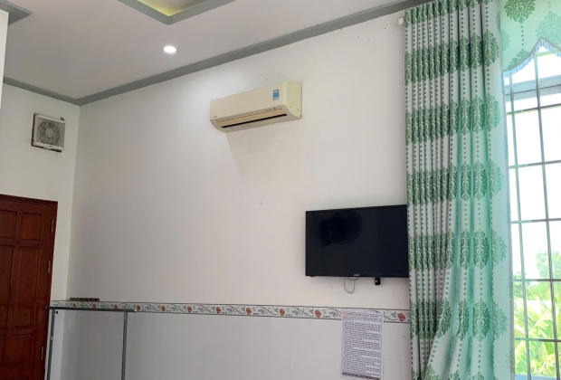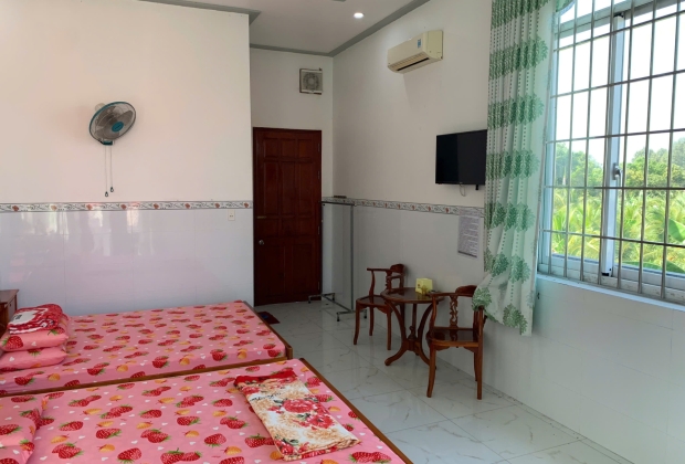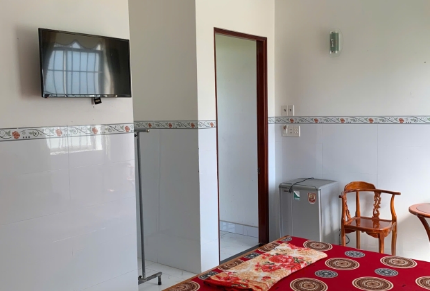 Phòng được trang bị đầy đủ tiện nghi gồm tủ lạnh mini, quạt máy, bàn ghế nhỏ và ghế đôn giúp khách hàng có không gian sinh hoạt thoải mái.